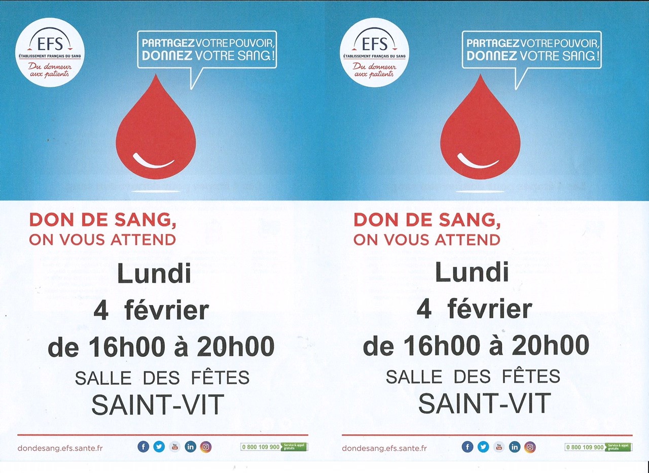 Prochaine collecte de sang à SAINT-VIT 25, le LUNDI 04 FEVRIER 2019